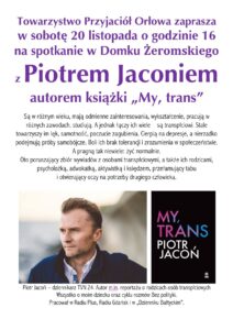 Zapraszamy na spotkanie autorskie z PIOTREM JACONIEM w sobotę 20 listopada o godz.16.00 w Domku Żeromskiego w Orłowie. Będzie okazja nabyć jego nową książkę „MY, TRANS” z autografem. Spotkanie prowadzi Sławomir Kitowski. Ze względu na przepisy sanitarne (a sala, jak wiedzą bywalcy, jest niewielka) zapraszamy tylko osoby zaszczepione i w maseczkach. Ilość miejsc ograniczona, wstęp wolny, wejście od ul. Zacisznej. Prosimy o wcześniejsze przybycie ze zwględu na duże zainteresowanie.