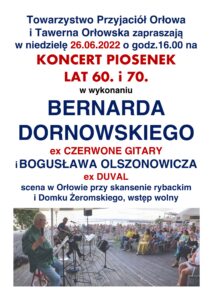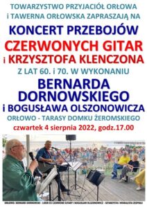Towarzystwo Przyjaciół Orłowa i Tawerna Orłowska zapraszają 30 sierpnia 2022 o godz.17.00 na spotkanie autorskie, poświęcone historii legendarnego zespołu CZERWONE GITARY Ilustrowane przebojami z lat 60 i 70. zaśpiewanymi na żywo w wykonaniu BERNARDA DORNOWSKIEGO, członka założyciela zespołu, w którym występował 40 lat, a w tym roku obchodzi 60-lecie pracy artystycznej. Zaśpiewa w duecie z BOGUSŁAWEM OLSZONOWICZEM, który jest gitarzystą i wokalistą w jego zespole „EX CZERWONE GITARY”. Obaj muzycy urodzili się w Orłowie i z sentymentem tu występują, a spotkanie i koncert poprowadzi SŁAWOMIR KITOWSKI, znawca historii zespołu. Wstęp wolny.