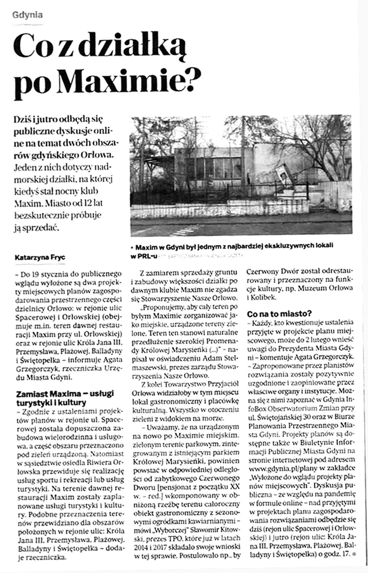 Artykuł red. Katarzyny Fryc w Gazecie Wyborczej z 13.01.21: