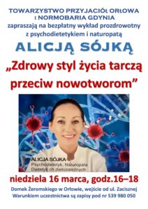 Towarzystwo Przyjaciół Orłowa zaprasza na kolejne spotkanie prozdrowotne organizowane w Domku Żeromskiego w niedzielę 16 marca 2025 o godz. 16.00. Psychodietetyk, dietetyk chorób dietozależnych Alicja Sójka przedstawi wykład pt. „Zdrowy styl życia jako tarcza przeciwko nowotworom”. Wstęp wolny, z uwagi na duże zainteresowanie i ograniczoną ilość miejsc obowiązuje rezerwacja telefoniczna pod nr 539 980 050. Partnerem wykładów prozdrowotnych jest Normobaria Gdynia, ul. Źródło Marii 45c. Więcej informacji: normogdynia.pl, alicjasojka.pl