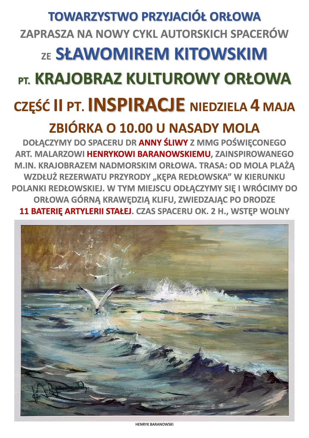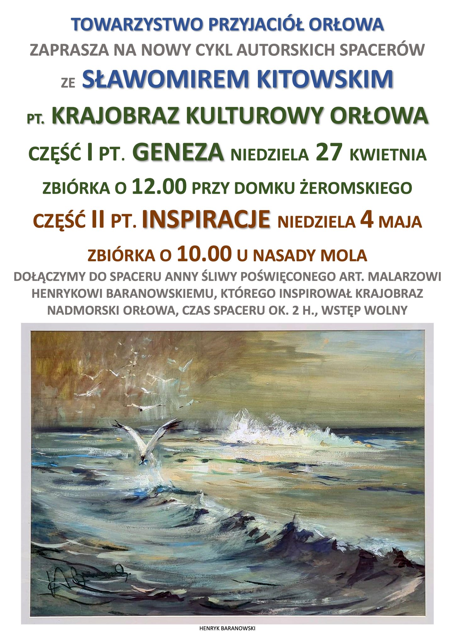 Zapraszamy w niedzielę 4 maja na drugi spacer historyczny ze Sławomirem Kitowskim w nowym cyklu „Krajobraz kulturowy Orłowa” pt. Inspiracje. Startujemy tym razem już o godz. 10.00, zbiórka przy molo orłowskim, gdzie połączymy siły ze spacerem poświęconym twórczości malarskiej Henryka Baranowskiego. Nie muszę dodawać, że inspirował się morskim krajobrazem Orłowa i Gdyni, ale o tym dowiemy się od kustosza dr Anny Śliwy z Muzeum Miasta Gdyni.
