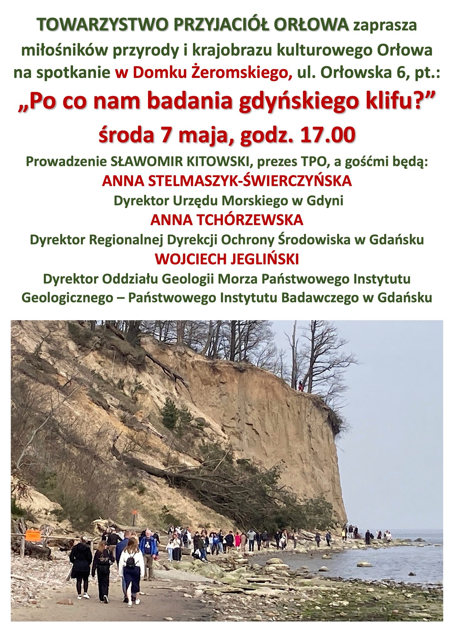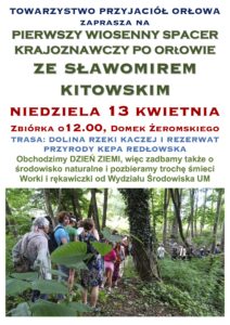 Towarzystwo Przyjaciół Orłowa zaprasza na pierwszy wiosenny spacer krajoznawczy ze Sławomirem Kitowskim w niedzielę 13 kwietnia o godz. 12.00. Z okazji Dnia Ziemi, sprzątniemy trasę spaceru, która obejmie teren rezerwatu przyrody Kępa Redłowska i dolinę rzeki Kaczej w części nadmorskiej Orłowa. Worki i rękawiczki zapewnił Wydział Środowiska UM. Zbiórka pod Domkiem Żeromskiego, ul. Orłowska 6.