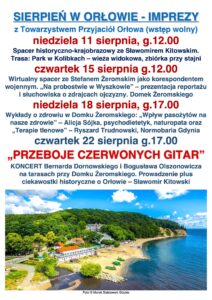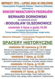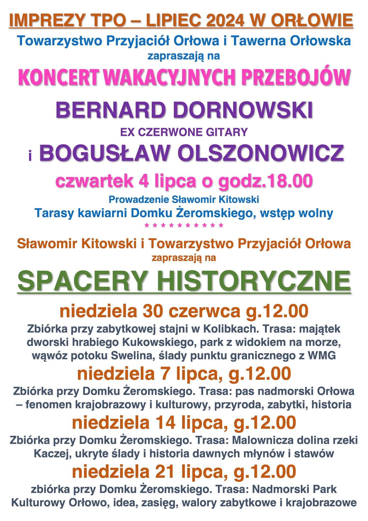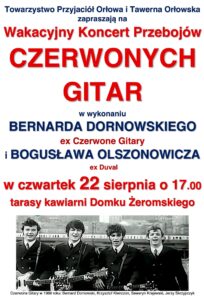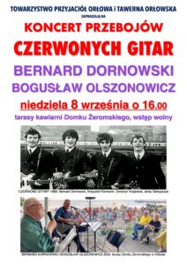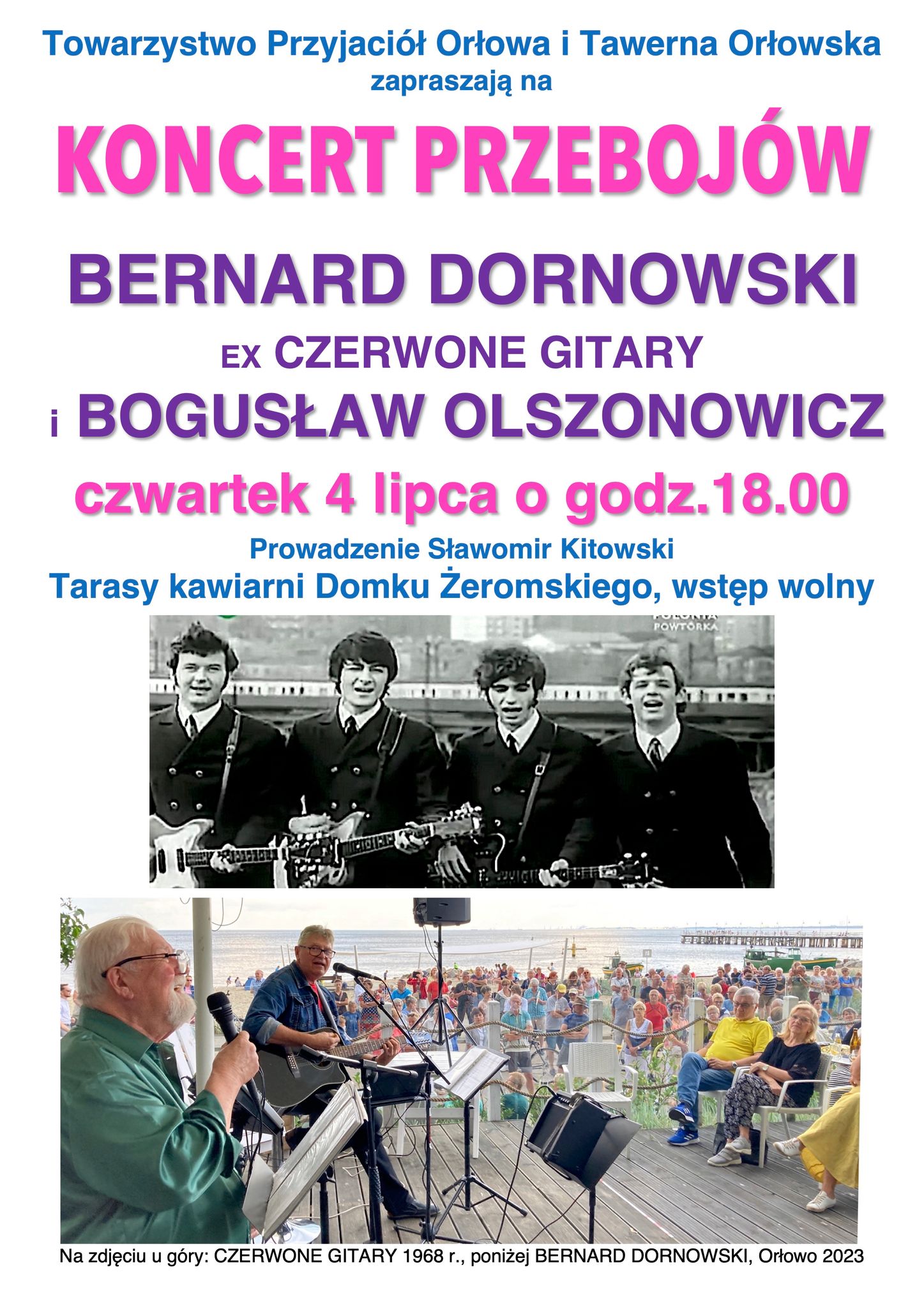 Wiadomość z ostatniej chwili. Z przykrością informujemy, że dzisiejszy, czwartkowy (22.08) KONCERT BERNARDA DORNOWSKIEGO w Orłowie ODWOŁUJEMY i PRZEKŁADAMY na niedzielę 8 WRZEŚNIA o godz. 16.00. Przyczyna – siła wyższa, choroba artysty. Przypominam, iż Bernard jest jednym z najstarszych weteranów big-bitu – 62 lata pracy na zawodowej estradzie i dziś w wieku 81 lat nadal jest w świetnej formie wokalnej. Ale o zdrowie musi dbać i my go w tym wspieramy. Przepraszamy wszystkich wybierających się dziś na koncert, ale zapraszamy już na 8 września, mamy nadzieję że w to niedzielne popołudnie pogoda będzie nam bardziej sprzyjać.